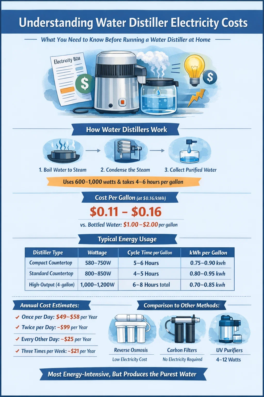 가장 널리 사용되는 가정용 정수기 중 Megahome, Pure Water, H2O Labs 및 CO-Z 모델은 효율성 비교에 지속적으로 등장합니다. 는 메가홈 조리대 증류기 예를 들어, 정격은 580W이고 약 5.5시간 만에 1갤런을 생산하며 갤런당 약 0.85kWh를 소비합니다. 이는 조리대 범위의 효율적인 끝 부분에 해당합니다. 다른 모델을 평가할 때 유용한 벤치마크입니다.
