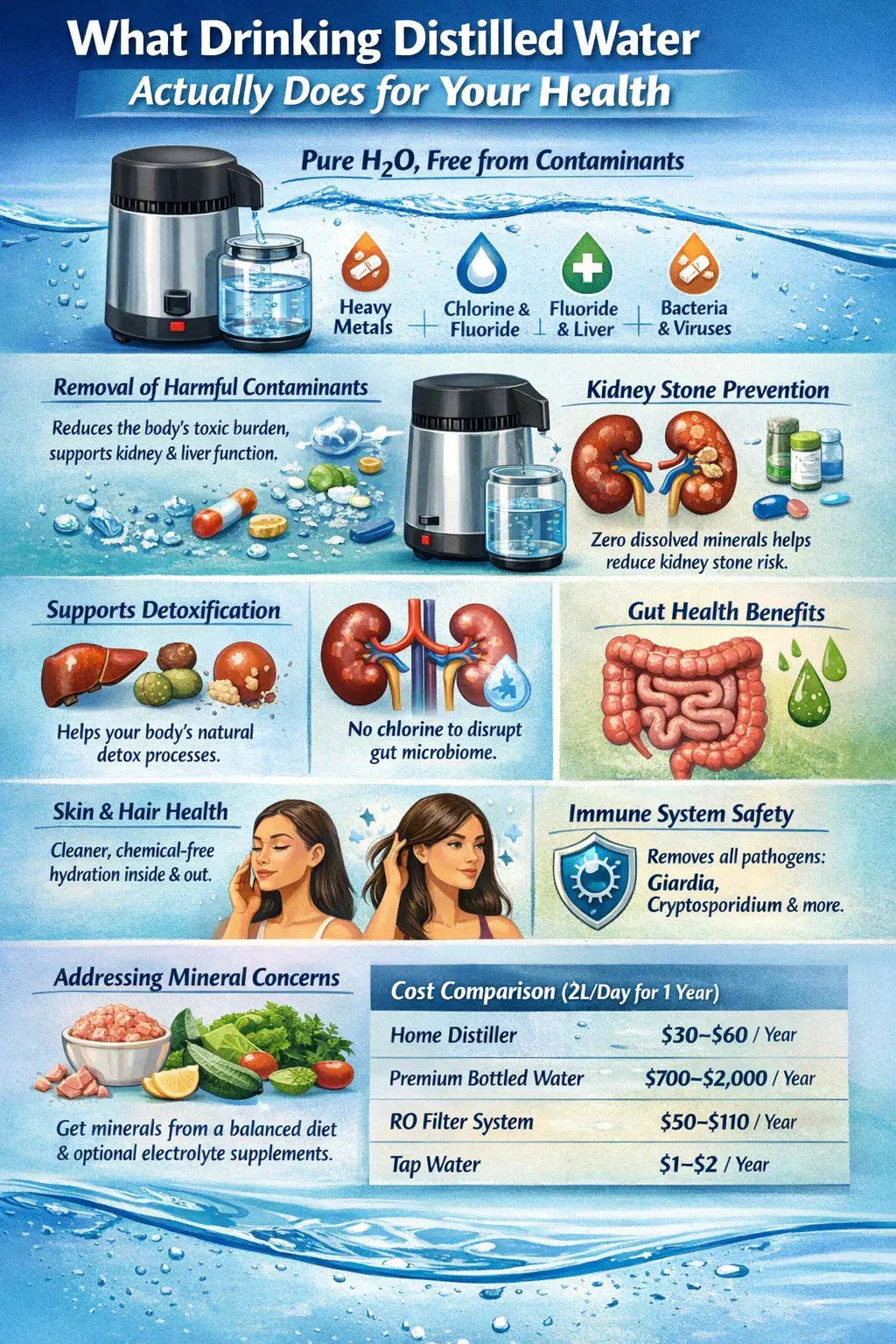 일반적으로 건강한 성인의 경우 그 혜택은 본질적으로 더 장기적이며 예방적입니다. 즉, 신체의 총 독성 부담을 줄이고, 신장과 간을 자연적인 기능으로 지원하며, 가장 기본적인 영양 섭취물인 물을 가능한 한 깨끗하게 유지하는 것입니다. 미네랄이 풍부한 식단과 함께 증류수는 건강을 중요하게 생각하는 모든 사람에게 실용적이고 저렴하며 과학적으로 건전한 선택입니다.