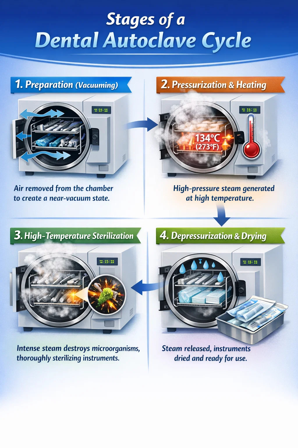 압력의 역할: 집에서 요리할 때 물은 섭씨 100도에서 끓고 온도가 더 이상 올라가지 않습니다. 그러나 치과용 오토클레이브의 밀폐된 공간에서는 더 많은 증기가 생성될수록 내부 압력이 크게 증가합니다.