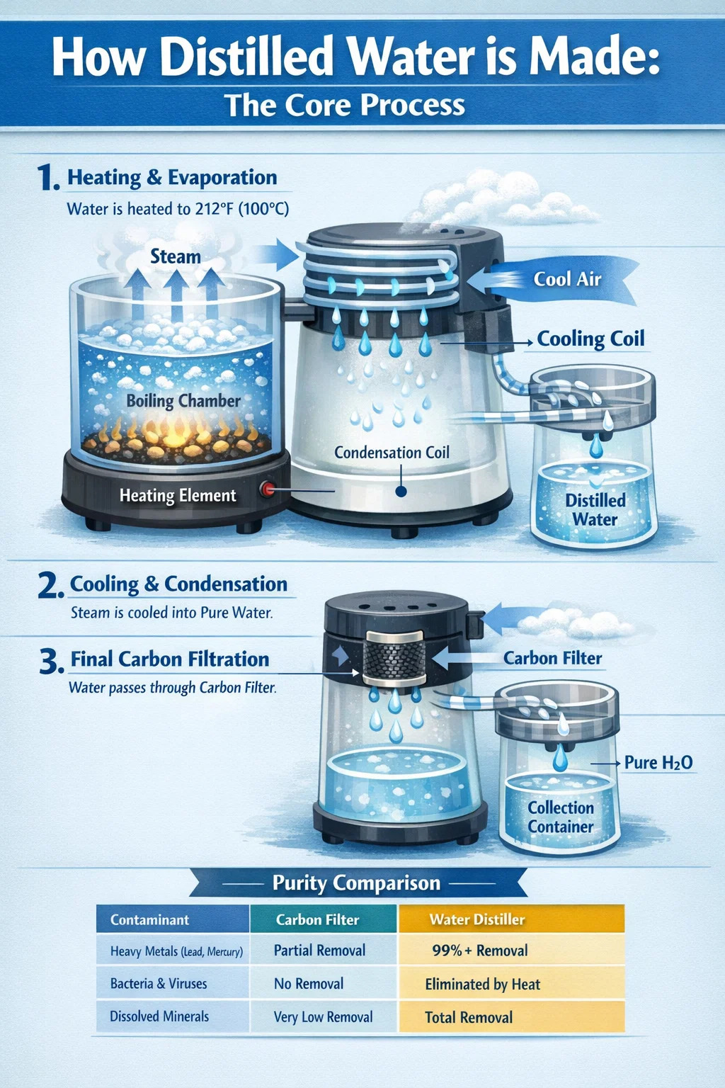 증류수가 어떻게 만들어지는지 이해하려면 물이 기계 내부로 들어가는 기계적 이동 과정을 살펴봐야 합니다. 단순한 여과와 달리 증류는 상변화 과정입니다.