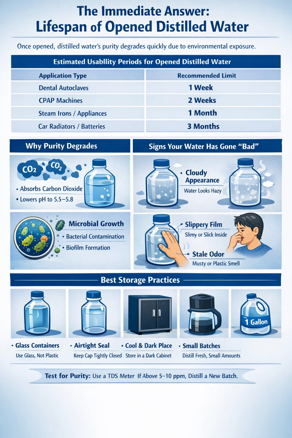 개봉한 증류수의 "유통기한"은 증류수의 용도에 따라 크게 달라집니다. 자동차 배터리에 대한 순도 요구 사항은 치과 수술 센터의 순도 요구 사항과 크게 다릅니다.
