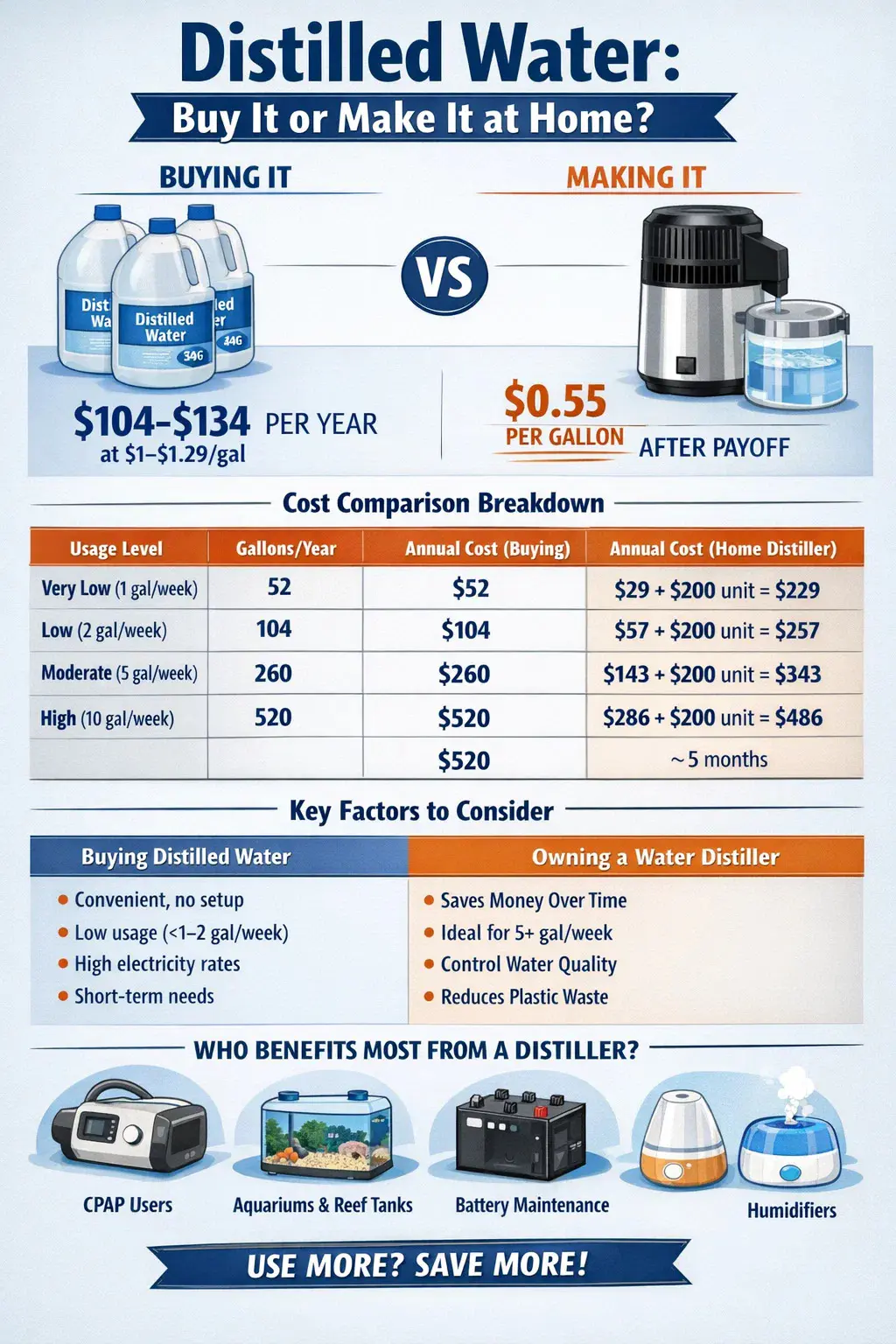사용량도 빠르게 확장됩니다. CPAP 기계는 평균 일주일에 약 1갤런을 사용합니다. 겨울 동안 작동하는 가습기는 매주 1~2갤런을 추가로 소비할 수 있습니다. 정기적인 보충이 필요한 바닷물 수족관에는 주당 3~5갤런이 필요할 수 있습니다. 태양광 설치 또는 백업 전원 은행의 납축 배터리에는 정기적인 증류수가 필요합니다. 이러한 용도를 함께 쌓으면 주당 5~10갤런을 사용하는 것이 일반적이므로 연간 매장 구매 비용이 연간 $260~$520 이상으로 증가합니다.